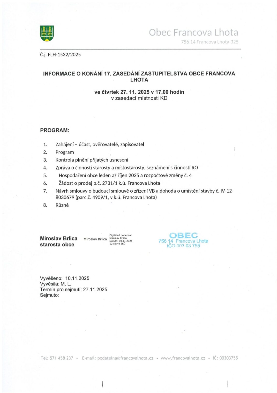 Informace o konání 17. zasedání ZO Francova Lhota – 27.11.2025