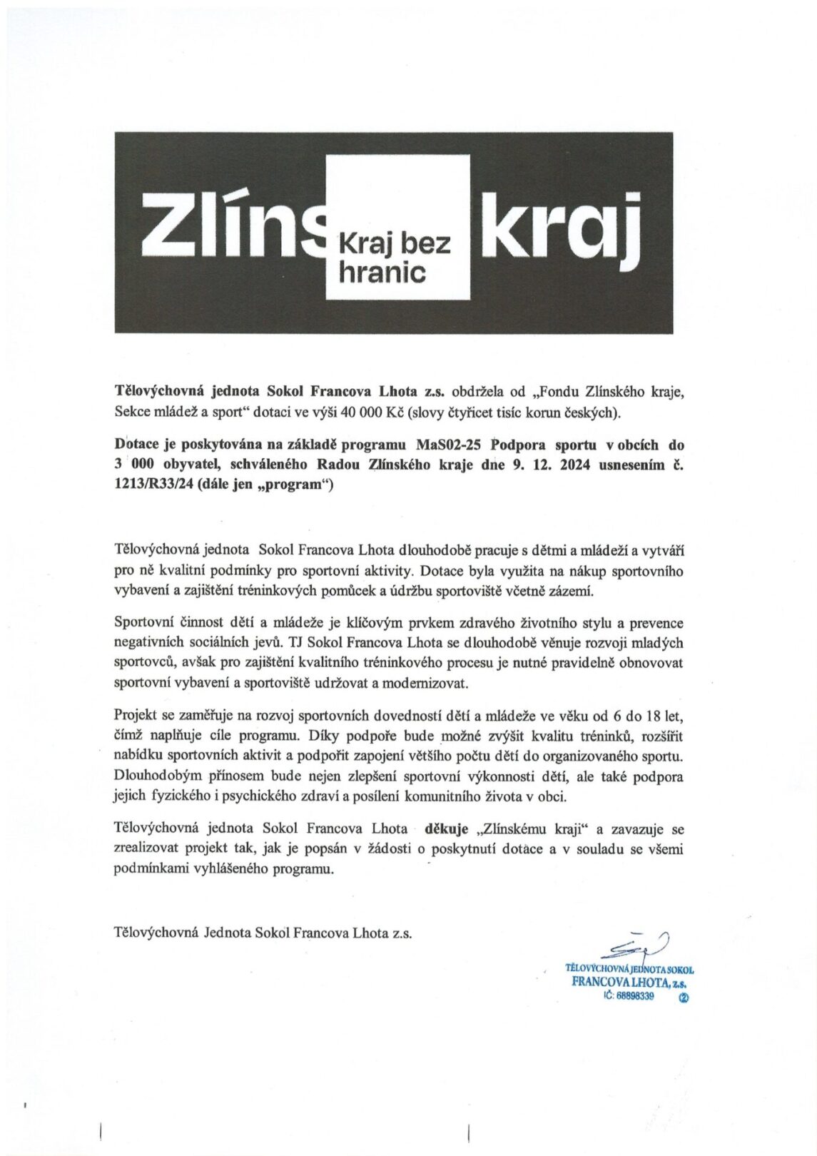TJ Sokol obdržela dotaci od „Fondu Zlínského kraje, Sekce mládež a sport“ ve výši 40.000,- Kč