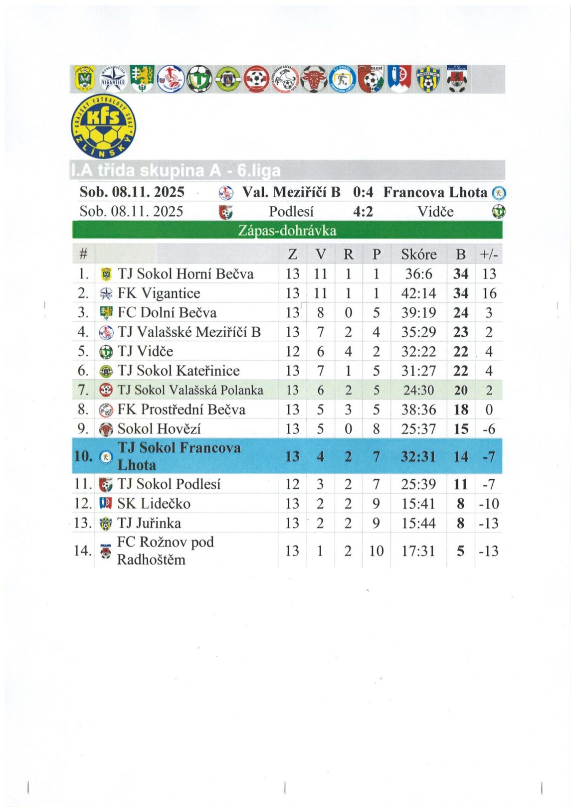 Výsledky fotbalu z 8.11.2025