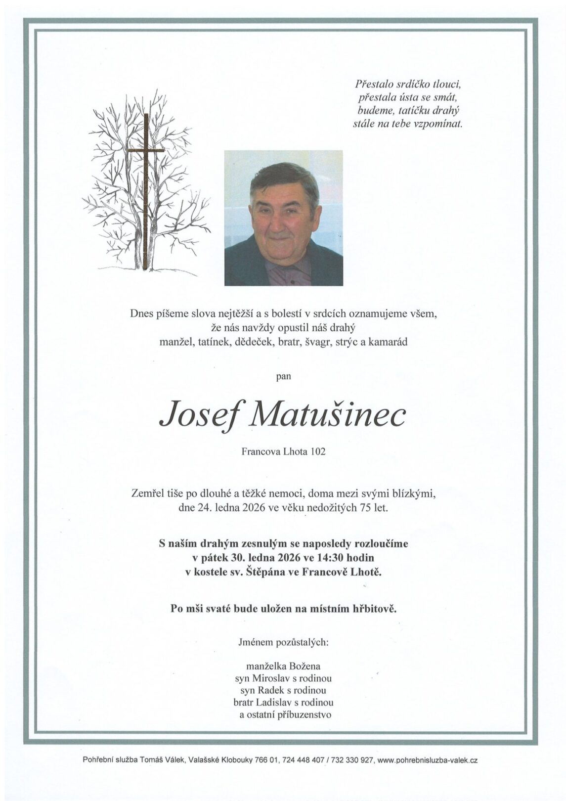 Smuteční oznámení pana Josefa Matušince