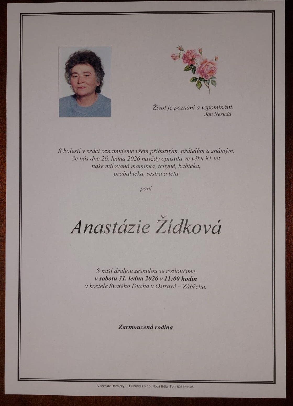Smuteční oznámení paní Anastázie Žídkové – zakladatelka VESNIČKY na Pulčíně