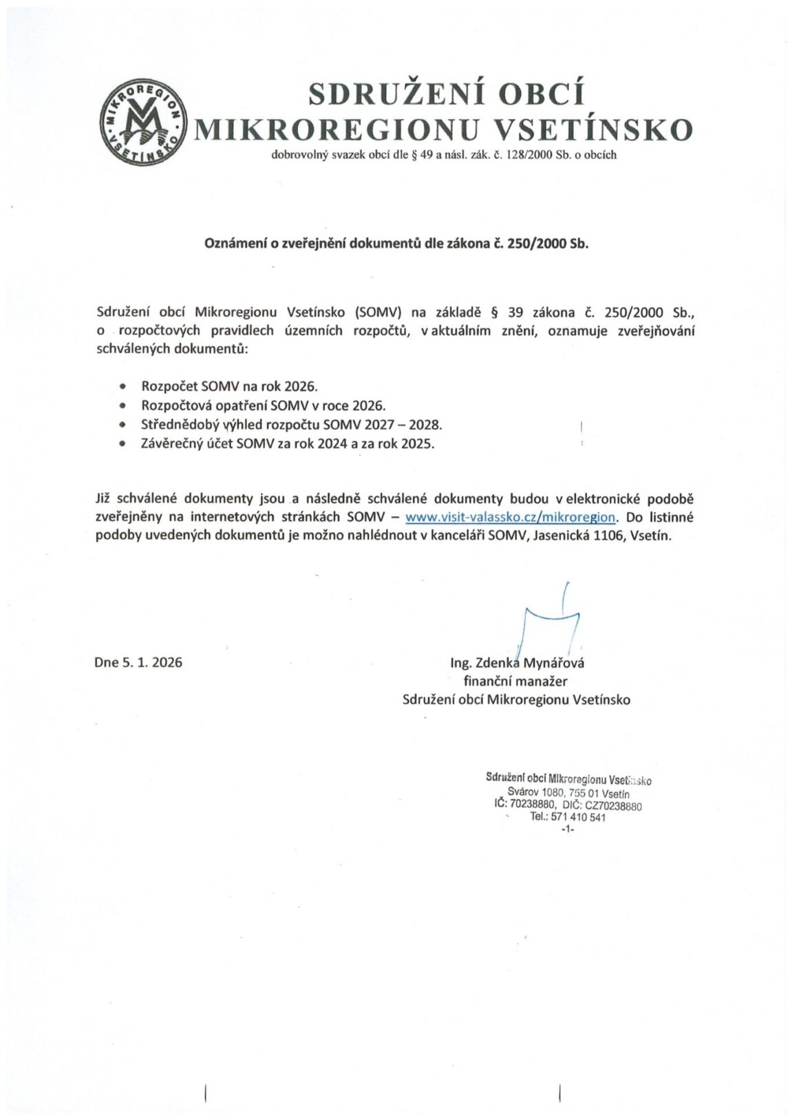 SOMV – Oznámení o zveřejnění dokumentů dle zák. č. 250/2000 Sb.