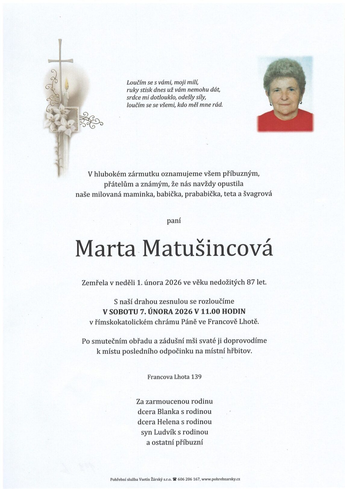 Smuteční oznámení paní Marty Matušincové