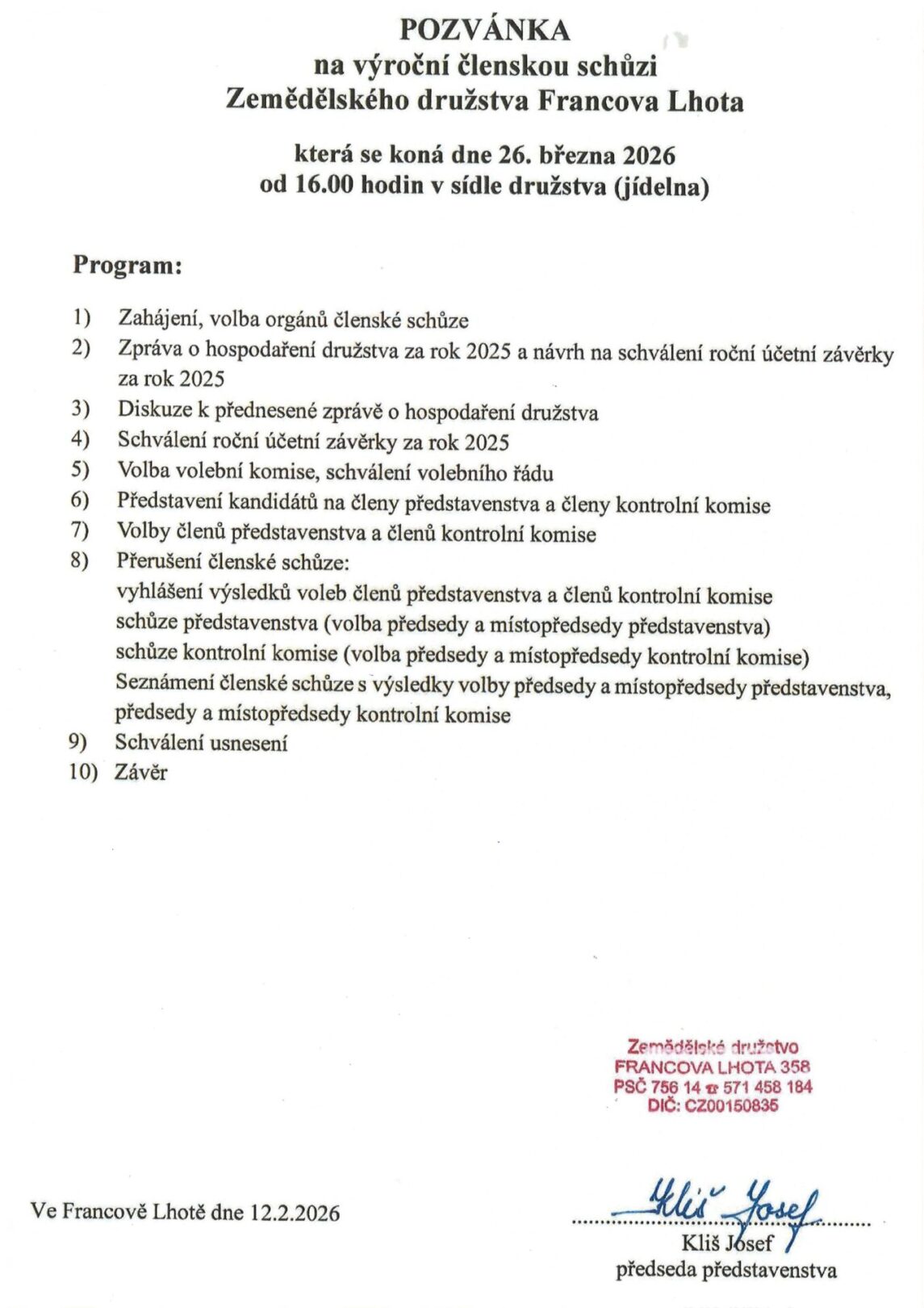 Výroční členská schůze Zemědělského družstva Francova Lhota – 26. března 2026
