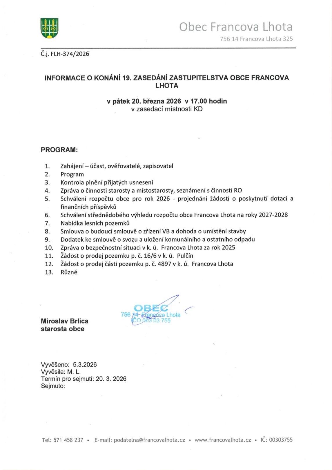 Informace o konání 19. zasedání ZO Fr. Lhota – 20.3.2026