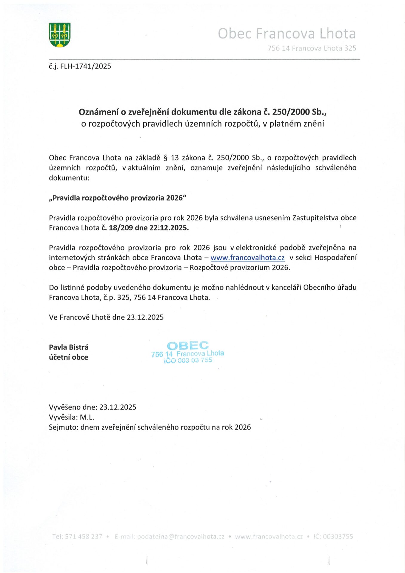 Farní úřad Francova Lhota oznamuje, že v sobotu 20. prosince 2025 od 8:00 hod. proběhne v kostele svatého Štěpána osazení vánočních stromů. V pondělí 22. prosince 2025 od 8:00 hod. proběhne zdobení těchto vánočních stromů a úklid kostela. Prosíme všechny ochotné farníky o pomoc při přípravách na vánoční svátky. Děkujeme.