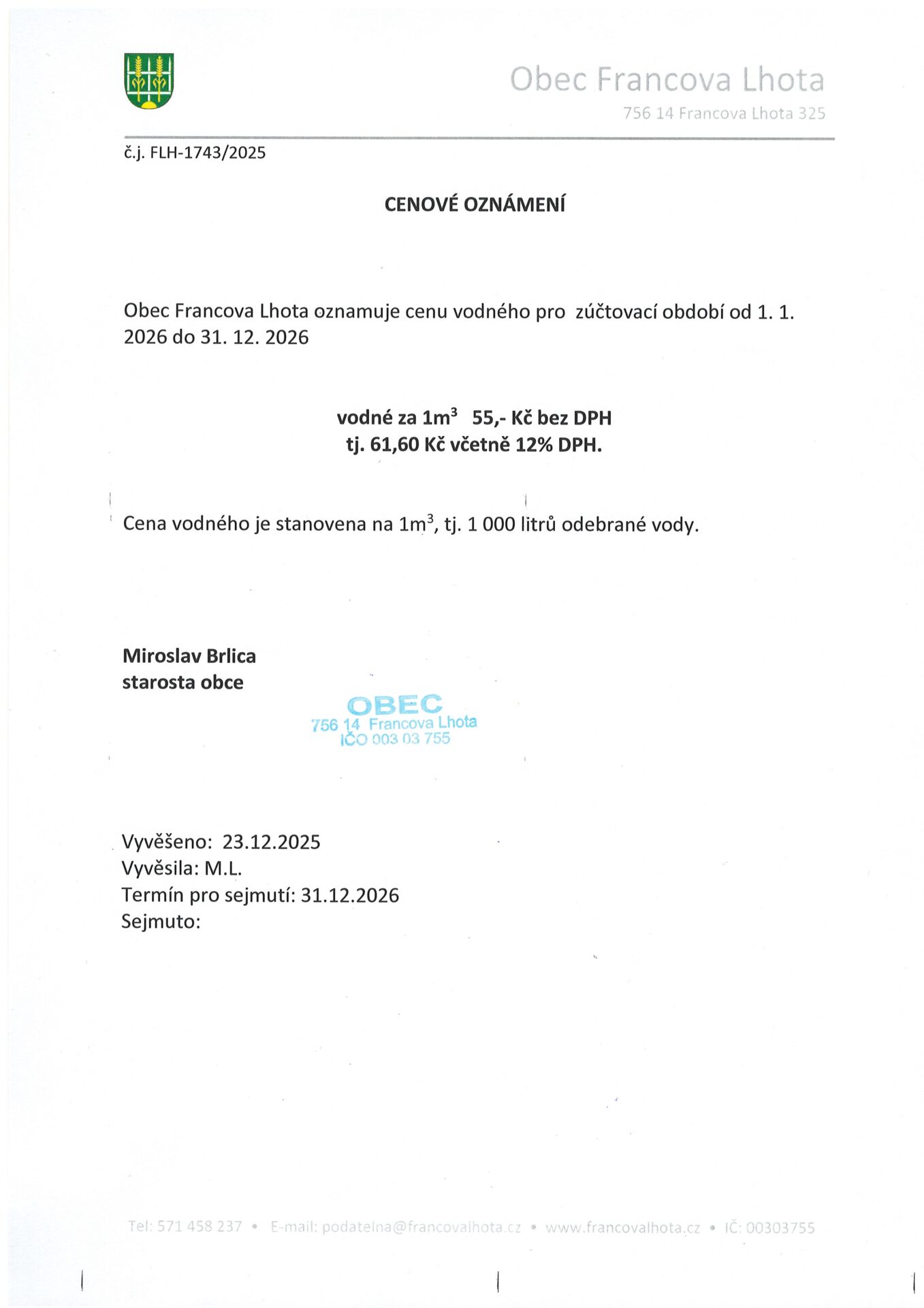 Zemědělské družstvo Francova Lhota zve srdečně všechny své členy na vánoční besedu, která se koná ve čtvrtek 11. prosince 2025 v 16.00 hodin v jídelně družstevního domu.